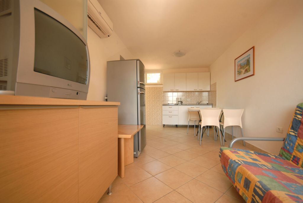 TYPE E: Two-room apartment with a seaview, air-conditioned, 40 m2, balcony, up to 5 persons; living room with sofa bed for 2 persons, 1 double room with extra bed, kitchenette, bathroom.